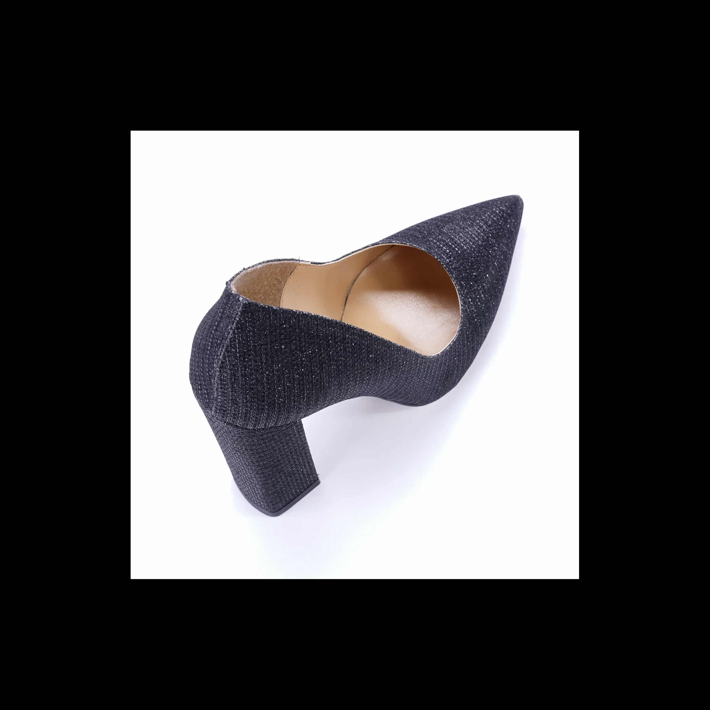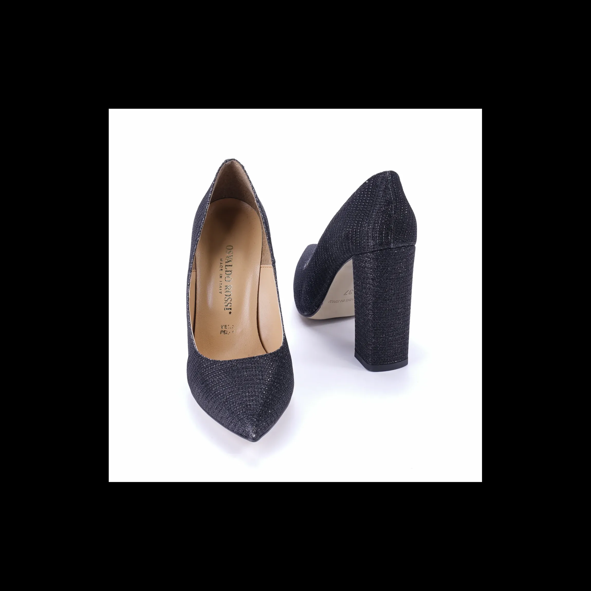 Décolleté Andrea Osvaldo Rossi Made in Italy in tessuto laminato colore nero. Tacco a blocco di 10 cm. Un brand italiano garanzia di qualità e di confort.