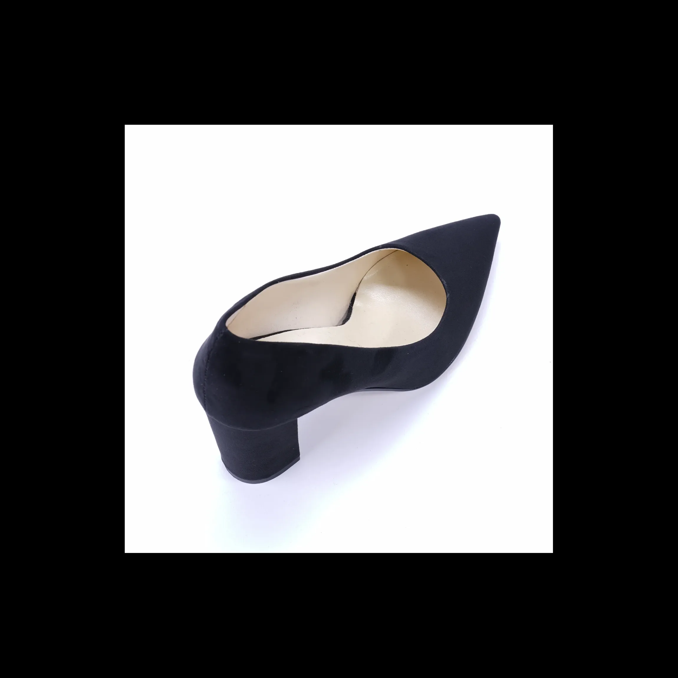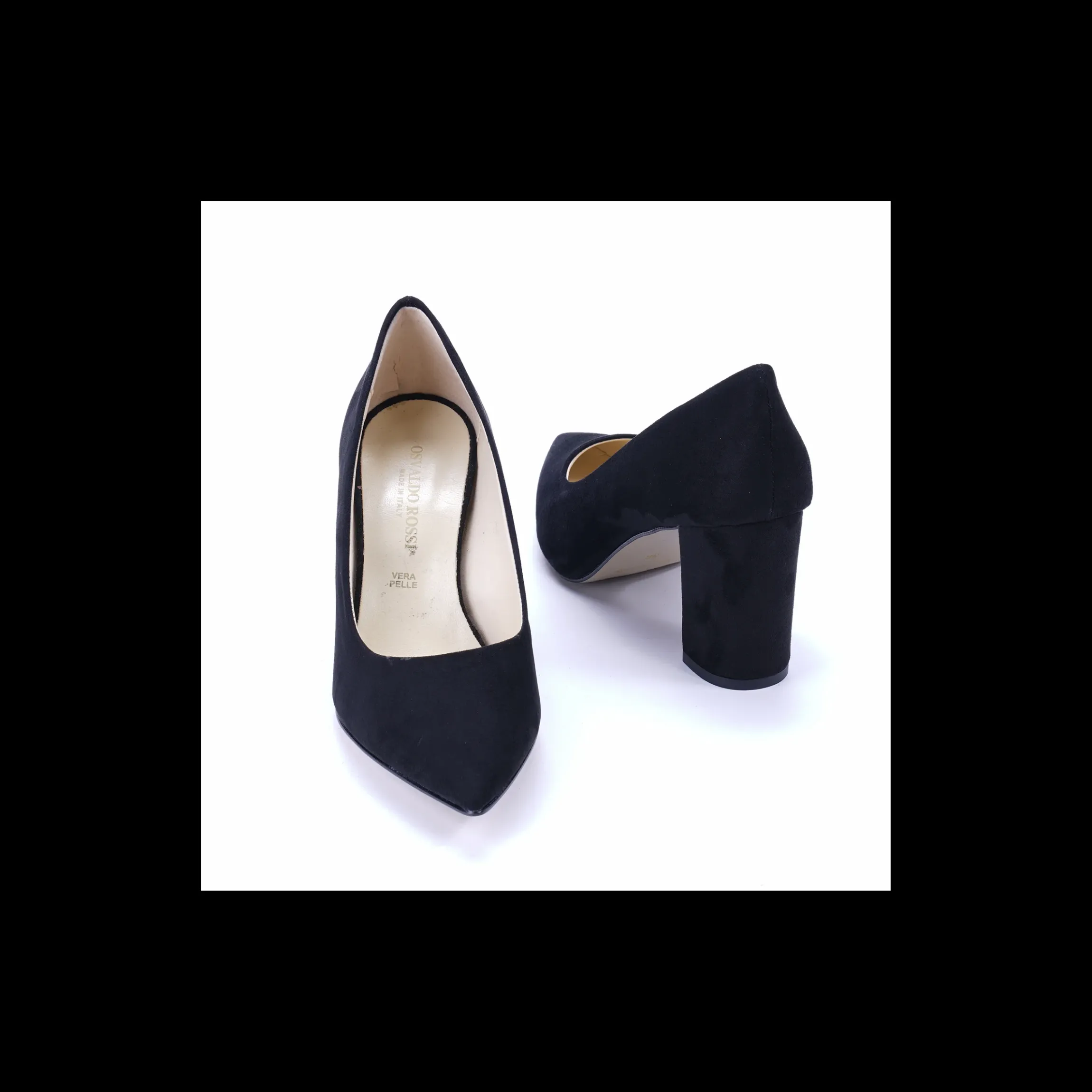 Décolleté Osvaldo Rossi Made in Italy in camoscio colore nero con tacco a blocco di 10 cm. Fondo in cuoio.