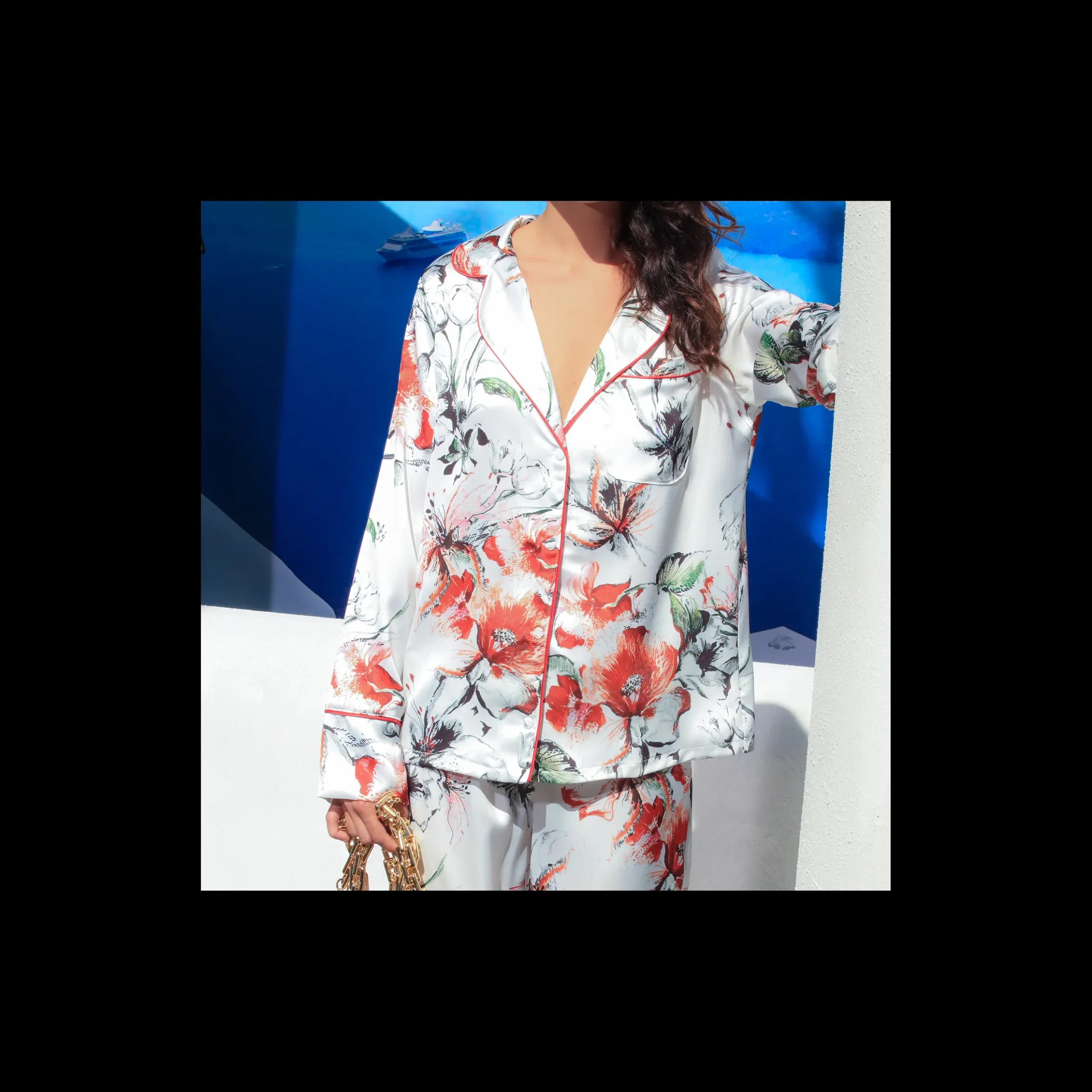 Giacca da poter utilizzare anche come camicia , di colore banco, con stampa floreale colorata, vestibilità fluida.