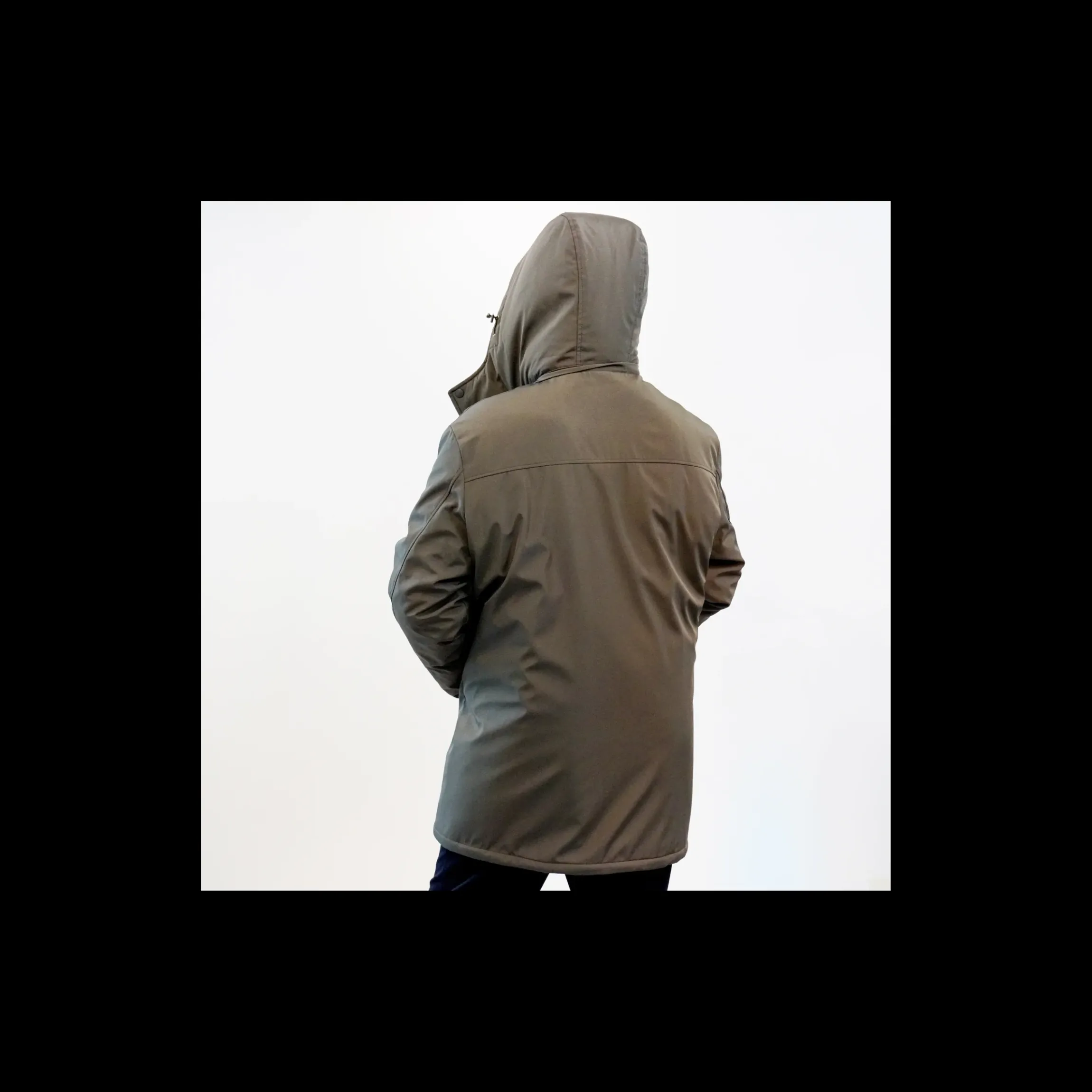 Giaccone Polbot uomo lungo di colore fango con cappuccio estraibile e multitasche.