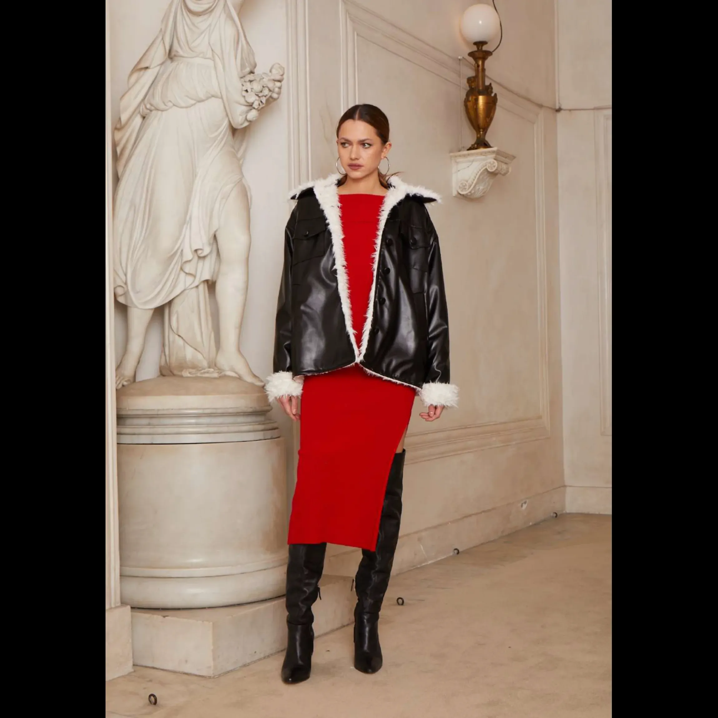 GIUBBOTTO GIULIA N COUTURE, IN ECOPELLE DI COLORE NERO E INTERNO ECOMONTONE DI COLORE BIANCO. BOTTONI FRONTALI E CHIUSURA STILE CAMICIA, CINTA IN VITA,E TASCHE LATERALI.