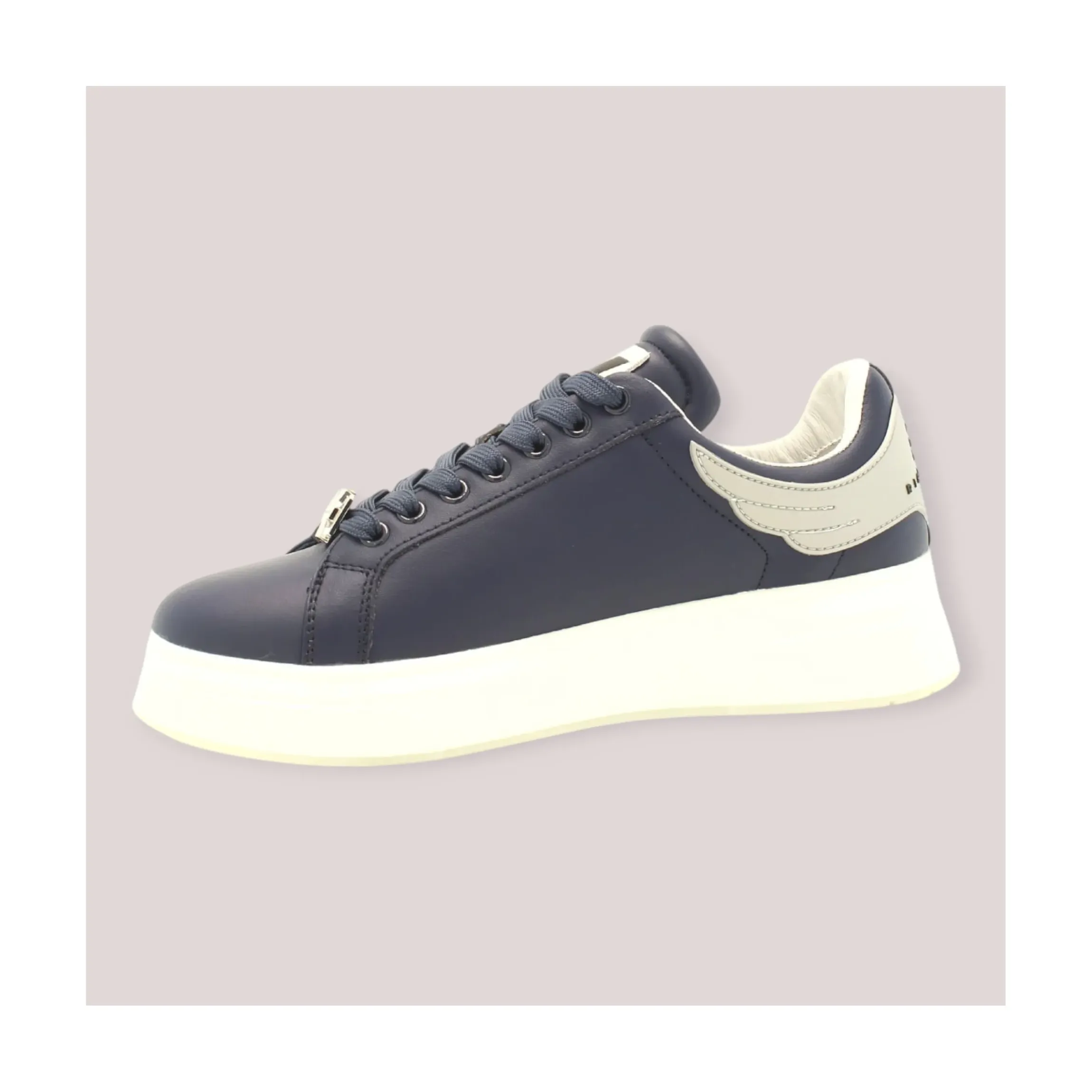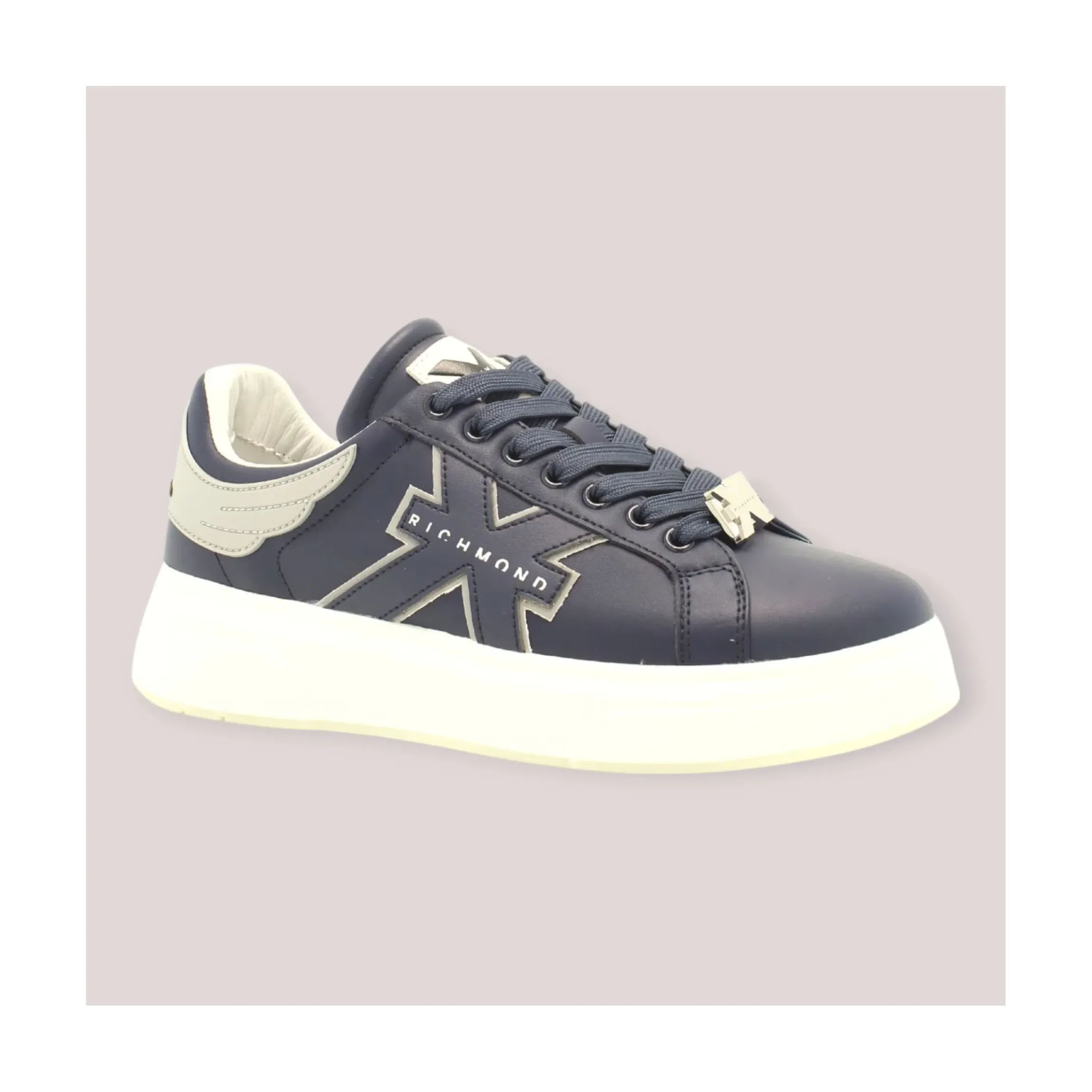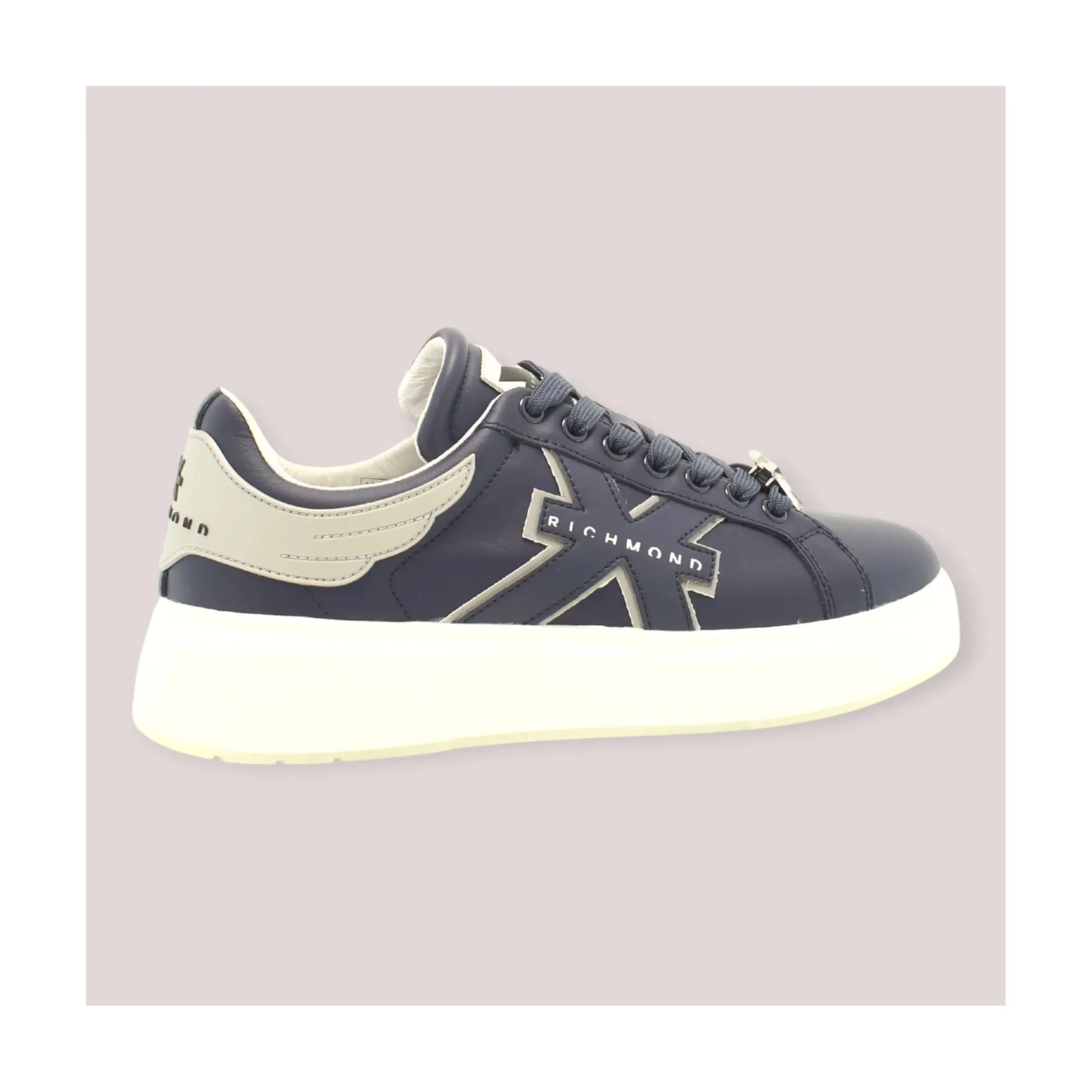 JOHN RICHMOND SNEAKERS UOMO BLU NAVY realizzata in pelle, suola in gomma di colore bianco alta 4 cm, soletta in pelle. Logo a contrasto sul tallone e linguetta, logo laterale rialzato, e placchetta metallica removibile sui lacci.
