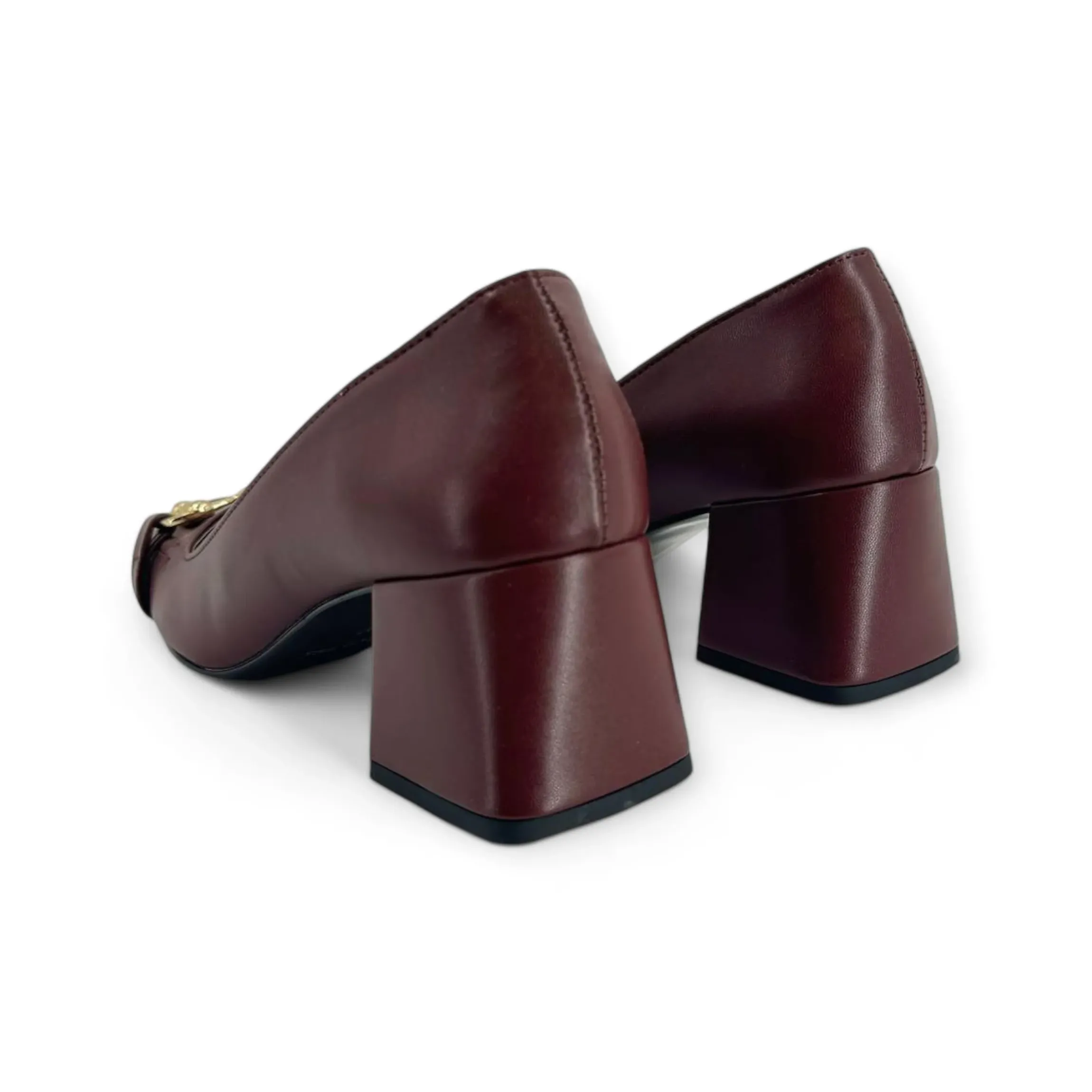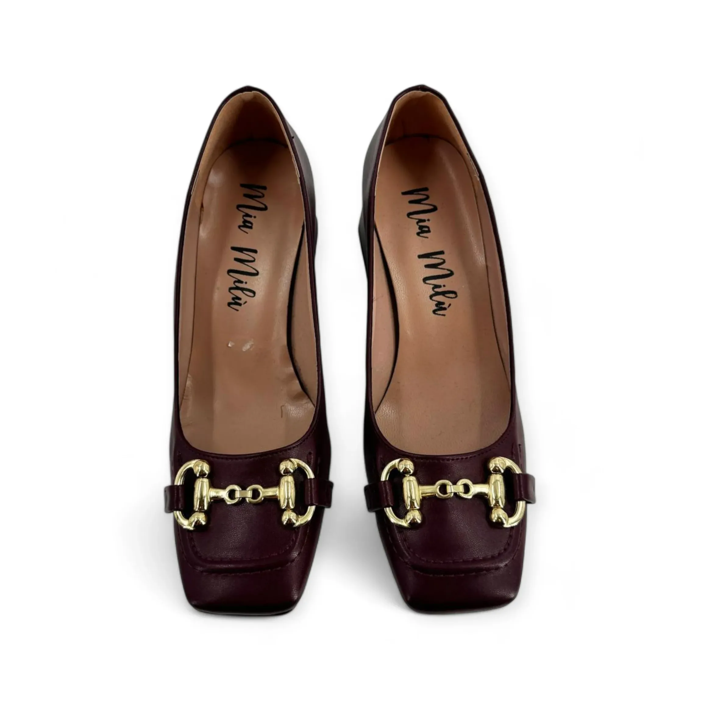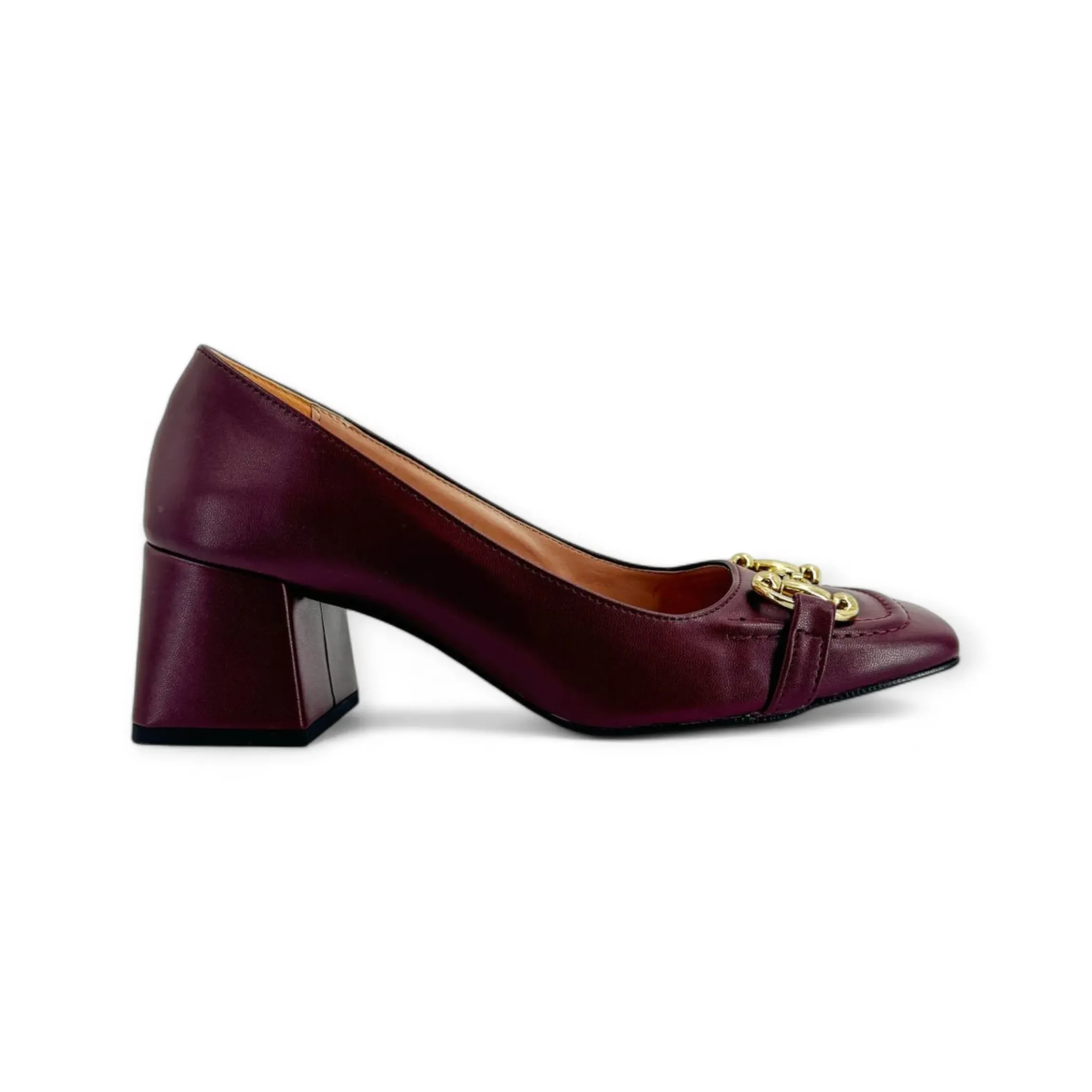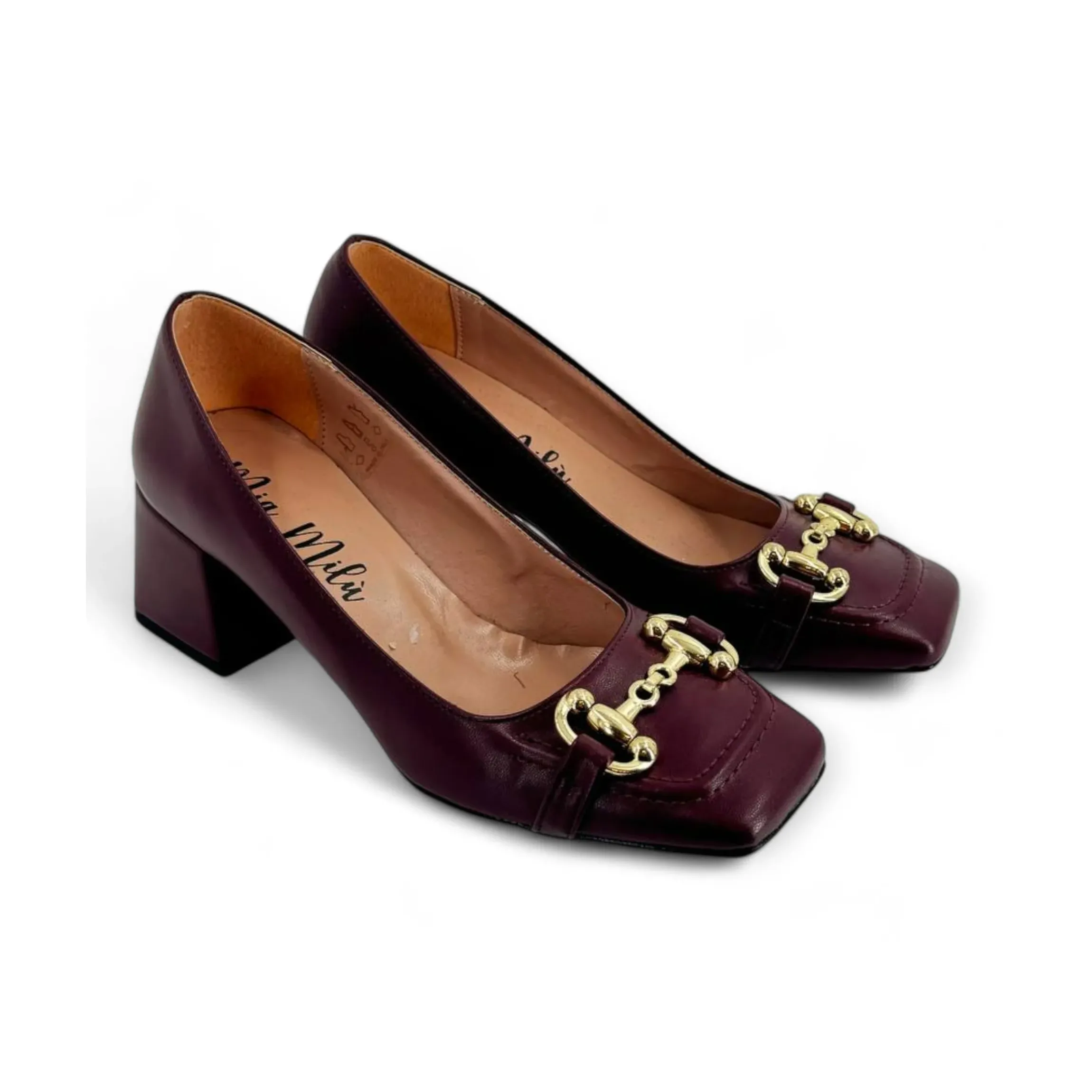 MILU’ MILANO DECOLLETE’ PUNTA QUADRATA CON MORSETTO color oro, tomaia in pelle e tacco quadrato alto 5cm.Calzatura made in Italy, disponibile nei colori bordeaux, verde, cipolla e nero