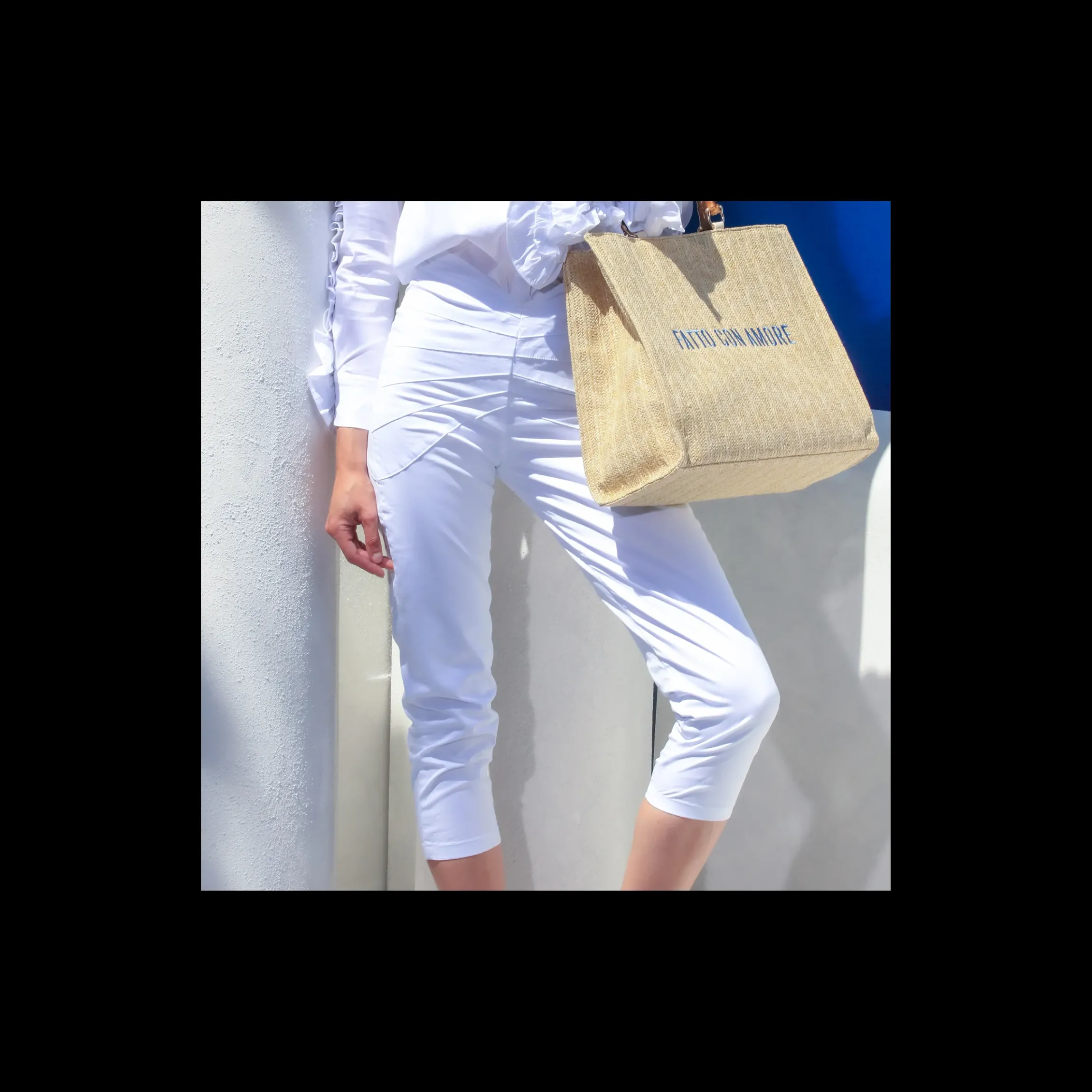 Pantalone in cotone elasticizzato, di colore bianco, con tagli e chiusura zip laterale invisibile.