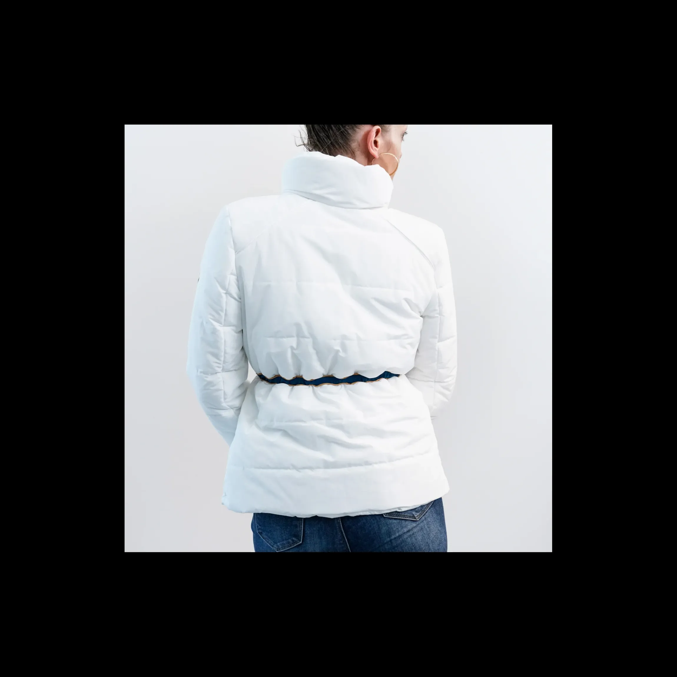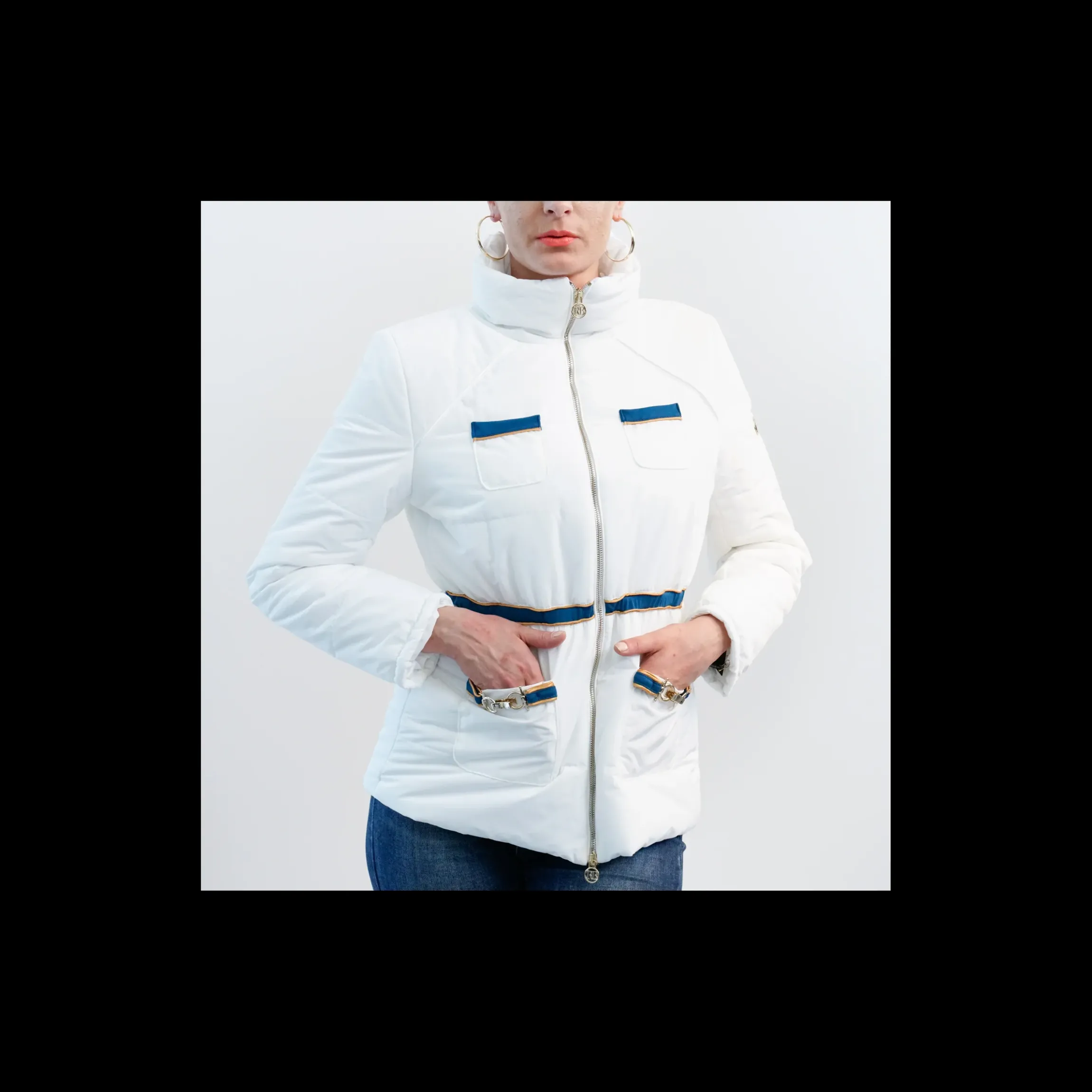 Piumino Roberta Biagi Donna A/I in tessuto trapuntato di colore bianco con dettagli di colore ceruleo e cuoio. Zip colore oro.