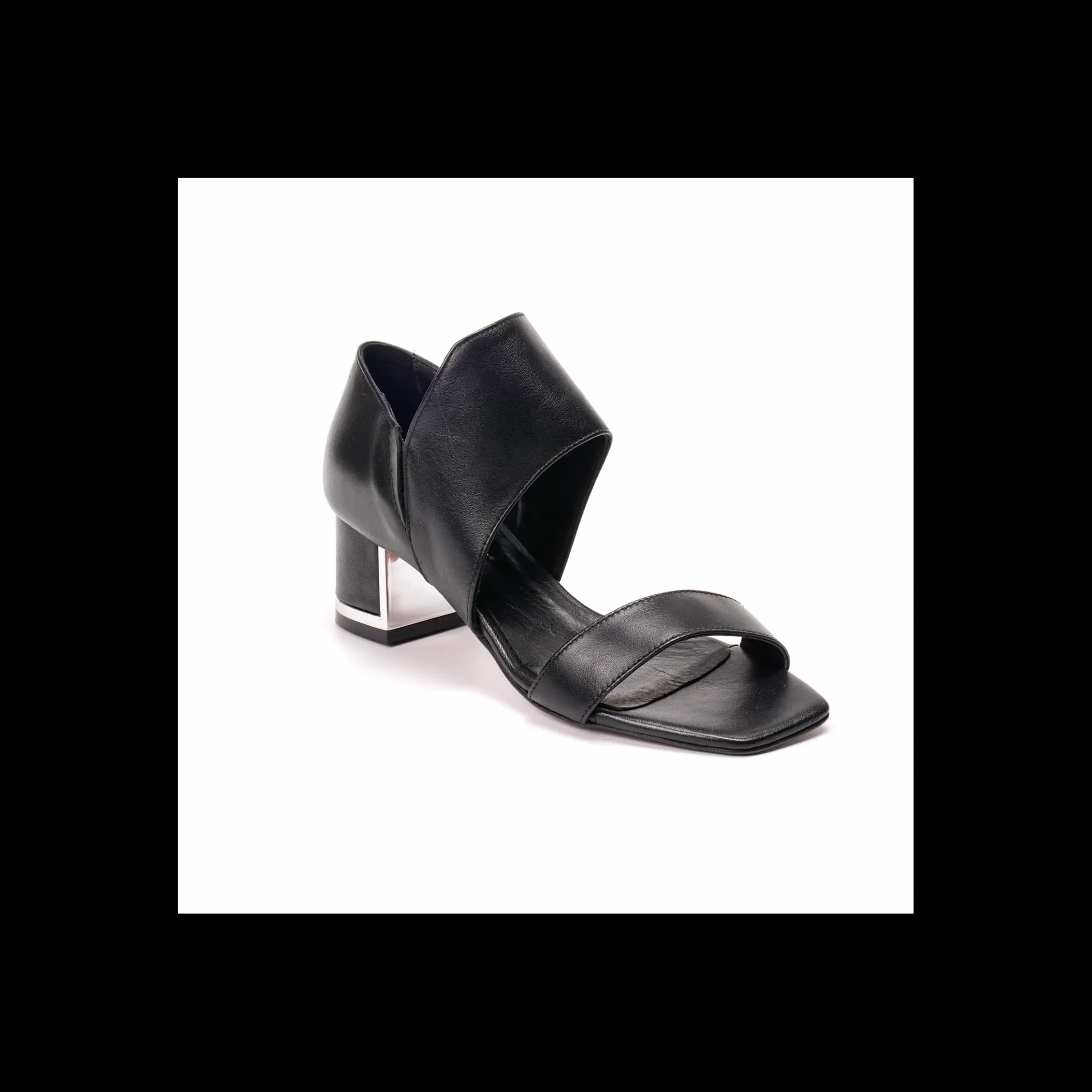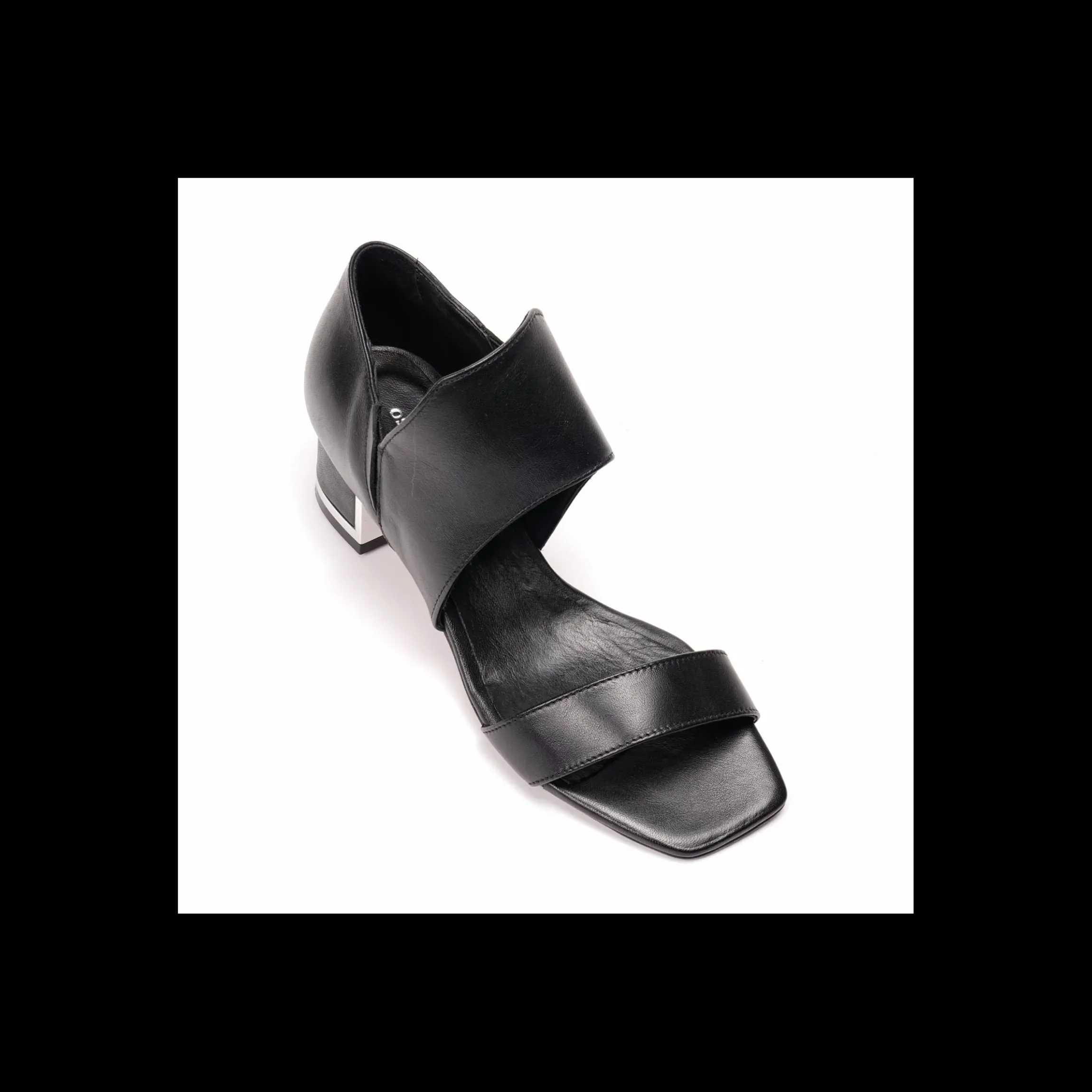 Sandalo Osvaldo Rossi, in pelle, di colore nero, tacco basso a blocco rivestito in pelle.