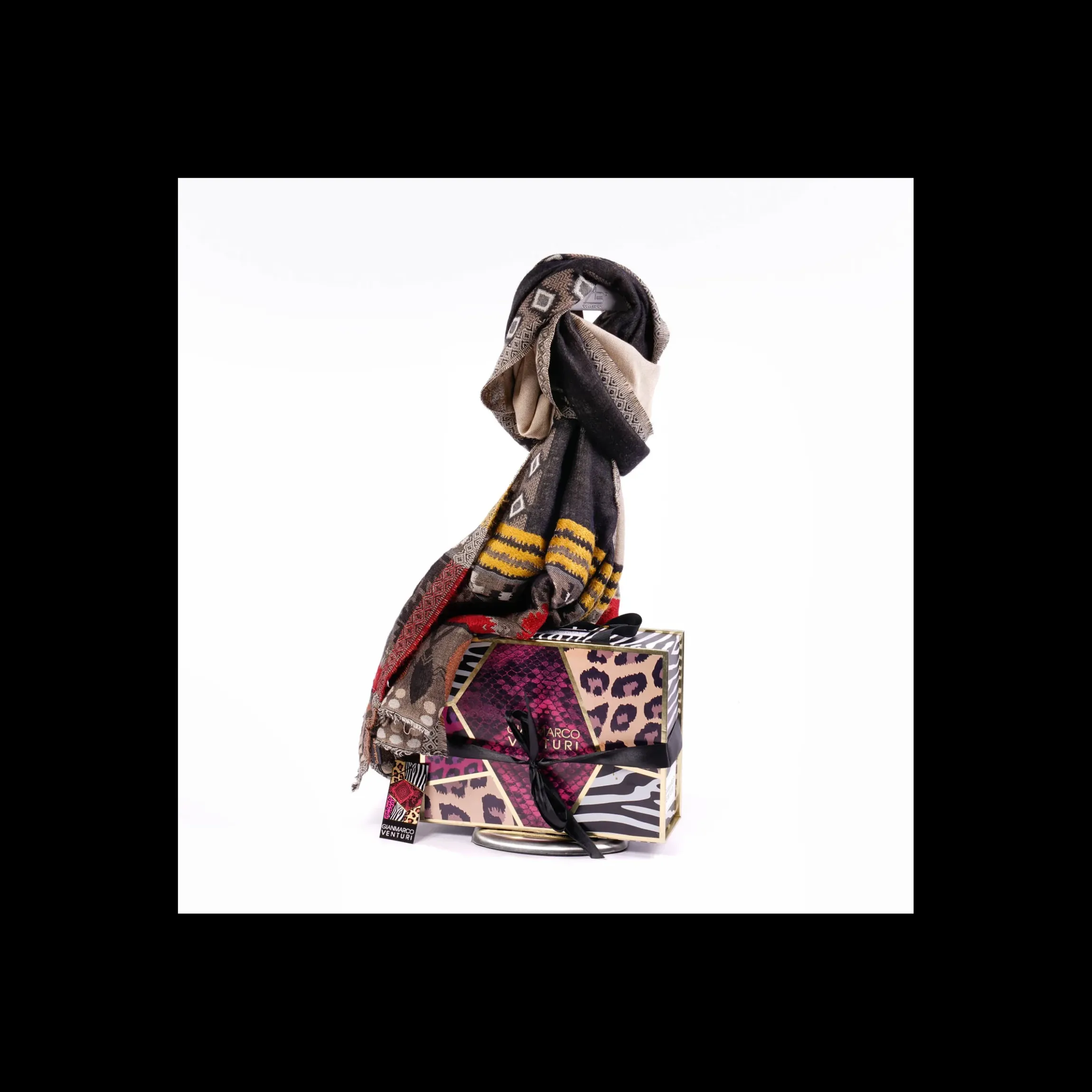 Confezione Sciarpone unisex GianMarco Venturi in tessuto fantasia etnica multi color , base colore rosso/taupe, sfrangiata corta