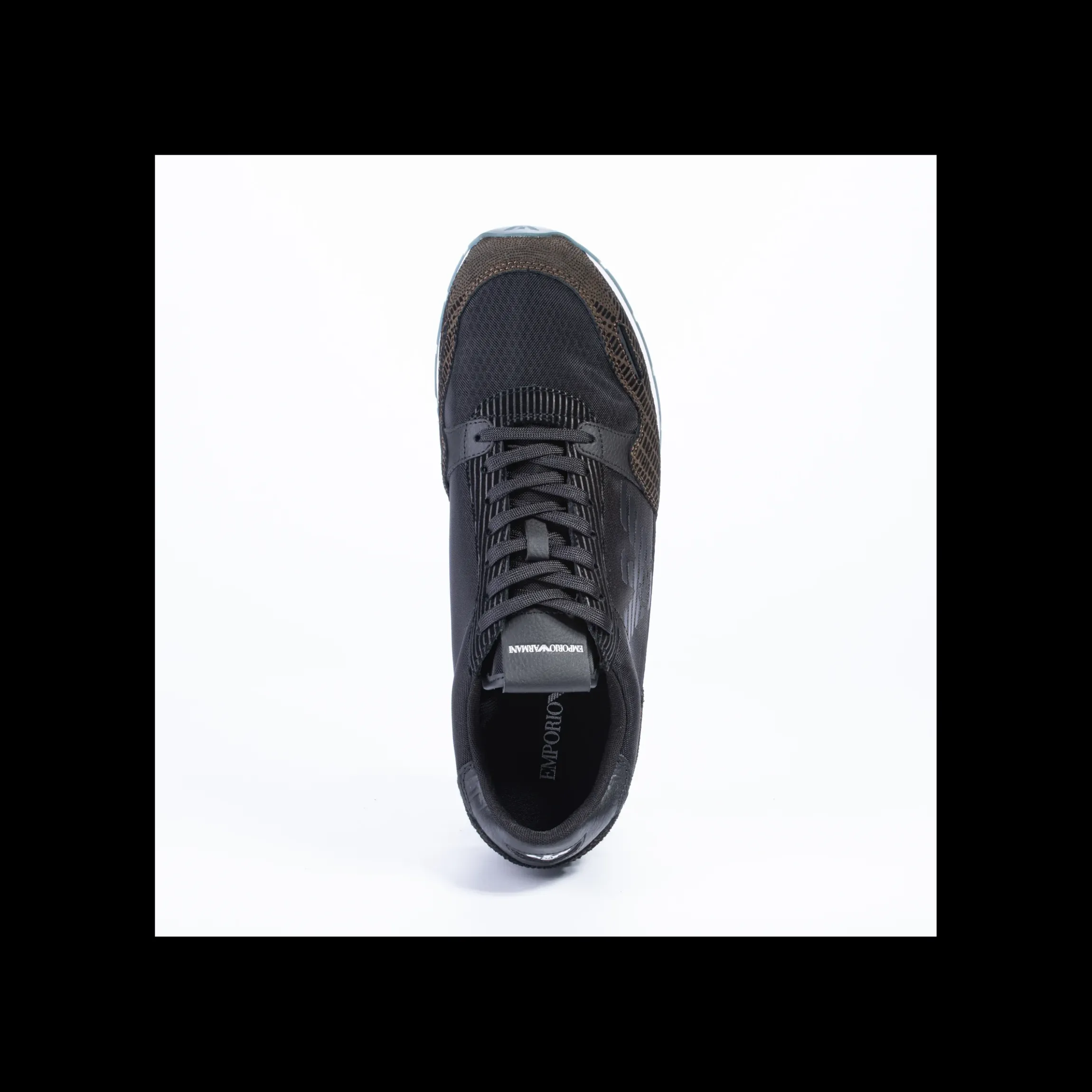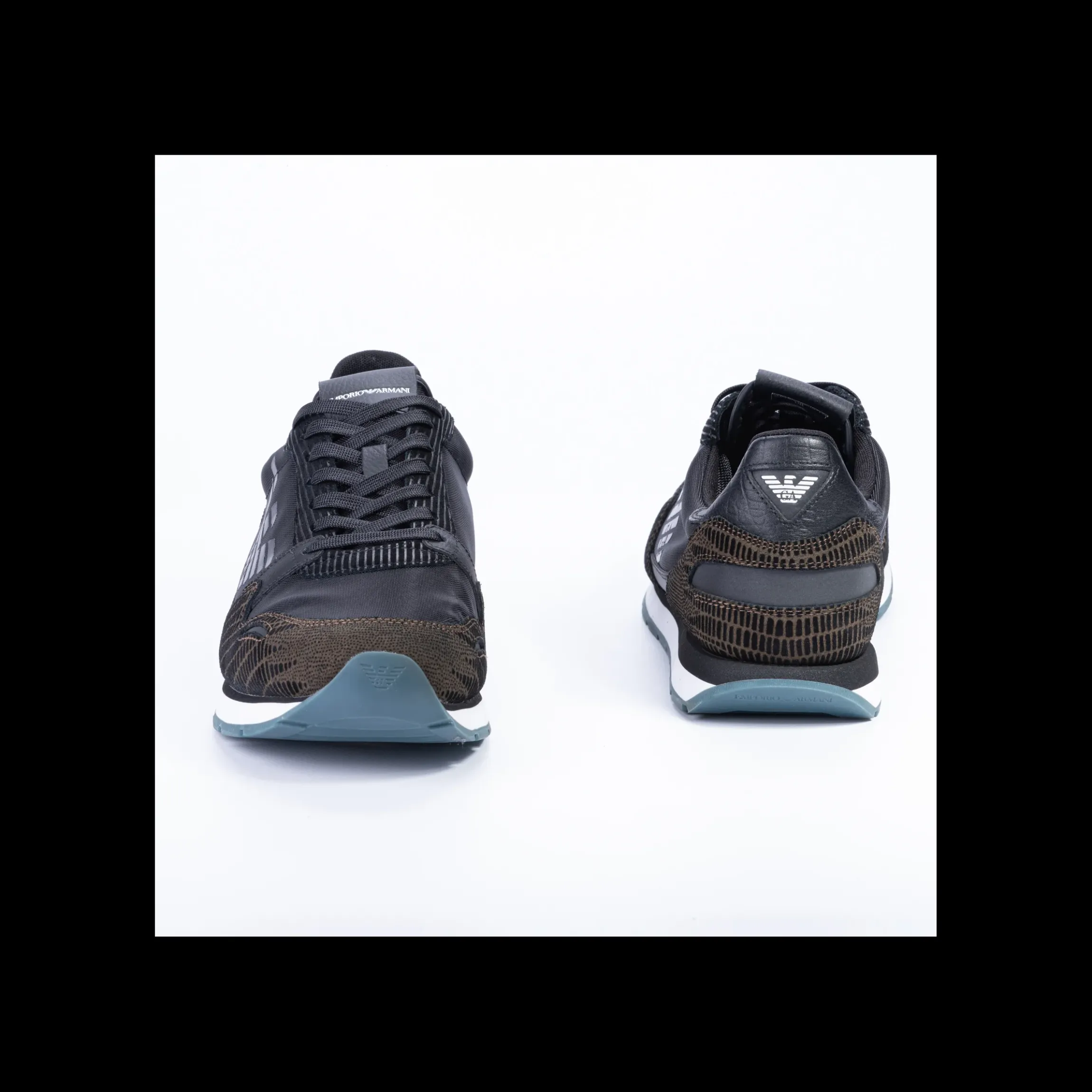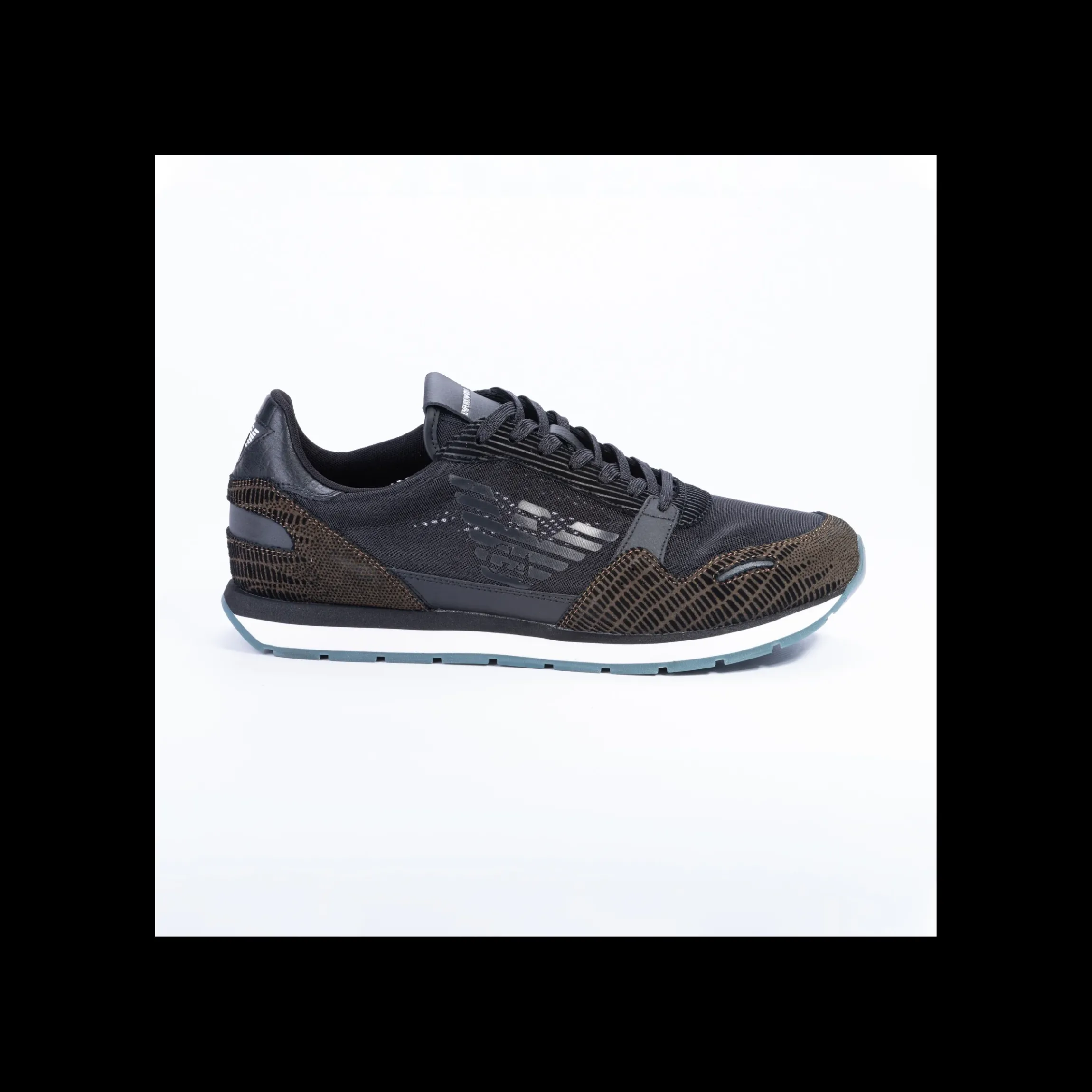 Sneakers uomo EMPORIO ARMANI in pelle ,camoscio e fibra tessile colore nero e verdone militare ,allacciata,para in gomma colore bianco/verde marchio impresso su laterale,patta frontale e tallone
