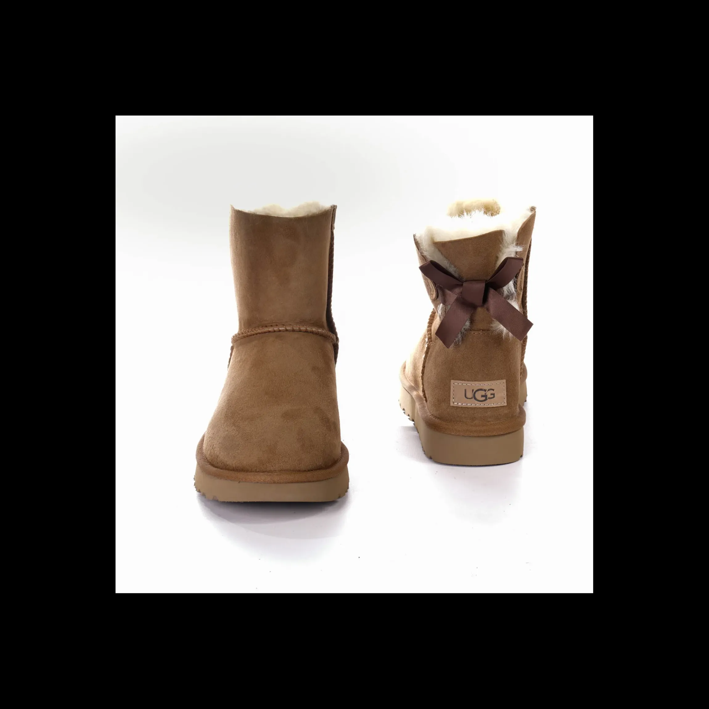 UGG MINY BAILEY BOW II STIVALE in montone e pelle scamosciata colore cuoio, pretrattato per resistere a umidità e macchie, fiocco fisso nella parte posteriore cuciture overlock, soletta in vello di pecora, rifiniture in nylon, realizzato con vera pelliccia di pecora o agnello.