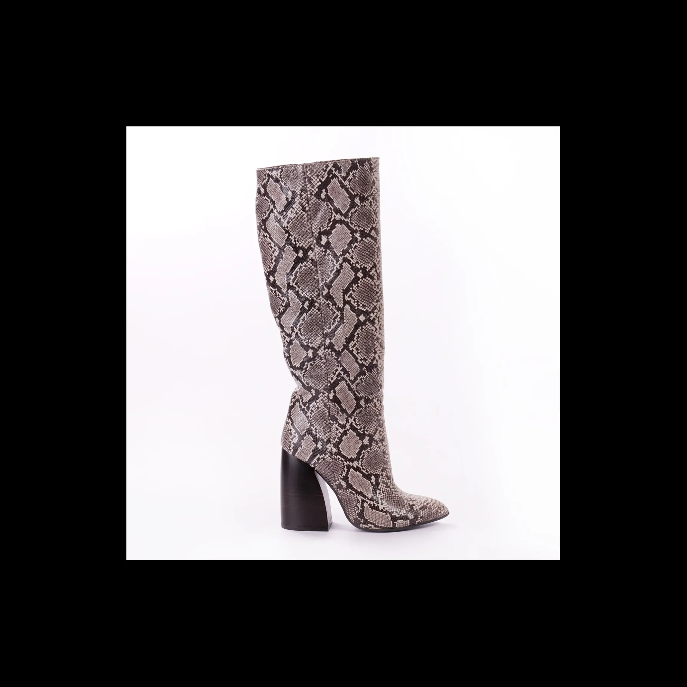 Stivali OSVALDO ROSSI in pelle stampa pitone, tacco alto svasato, interno in pelle, fondo cuoio con antiscivolo