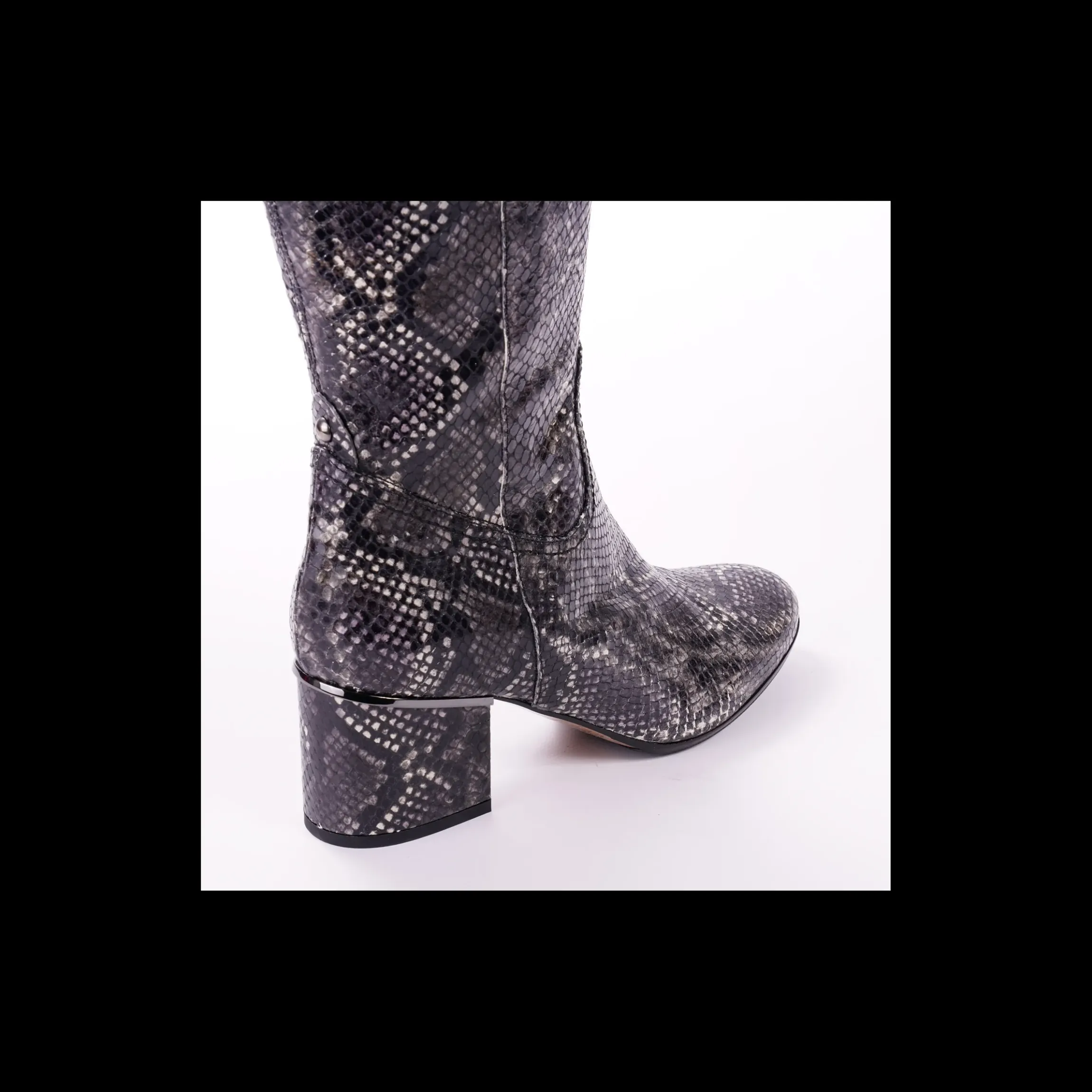 Stivali OSVALDO ROSSI in pelle stampa pitone colore grigio, tacco quadrato 5 cm, interno in pelle, fondo cuoio con antiscivolo