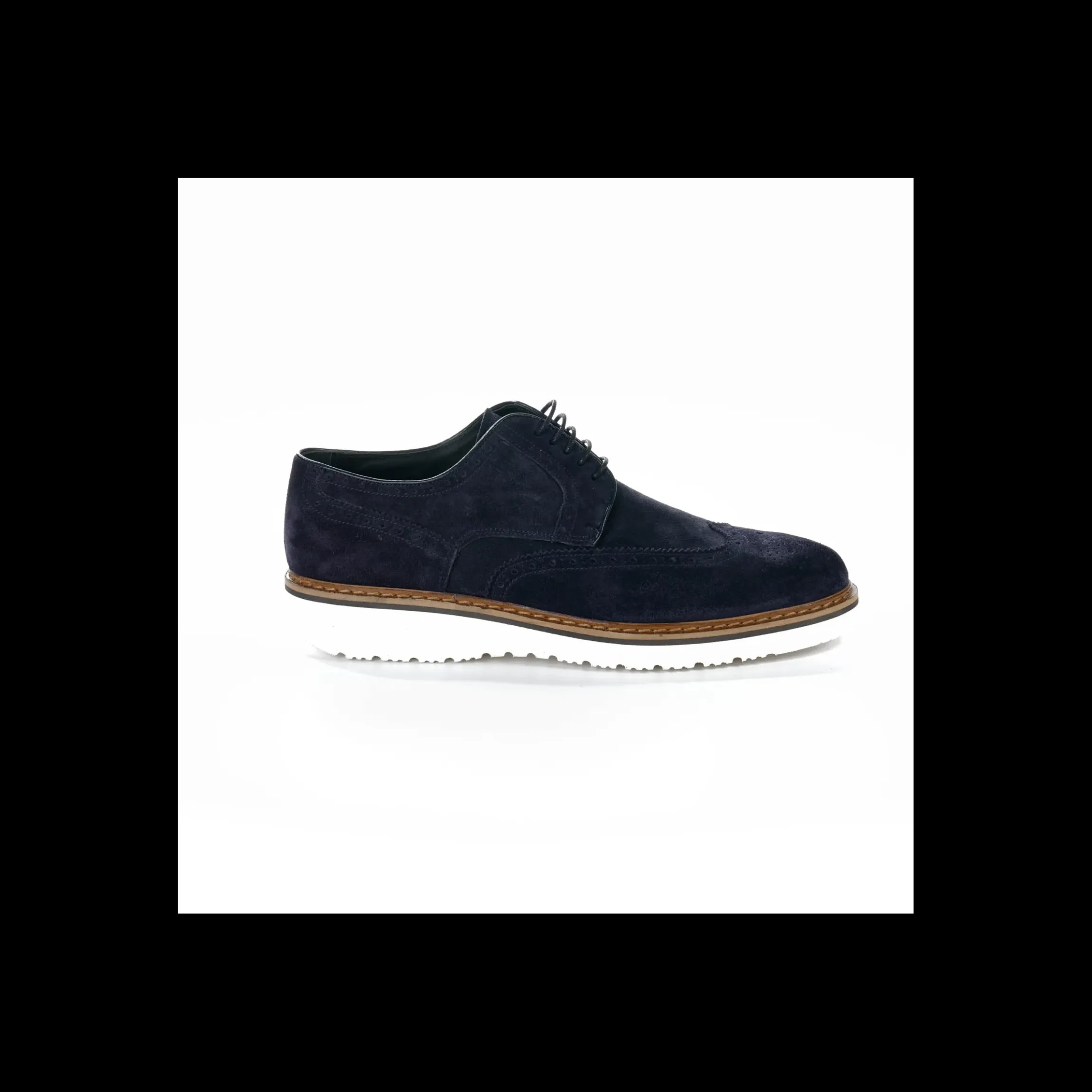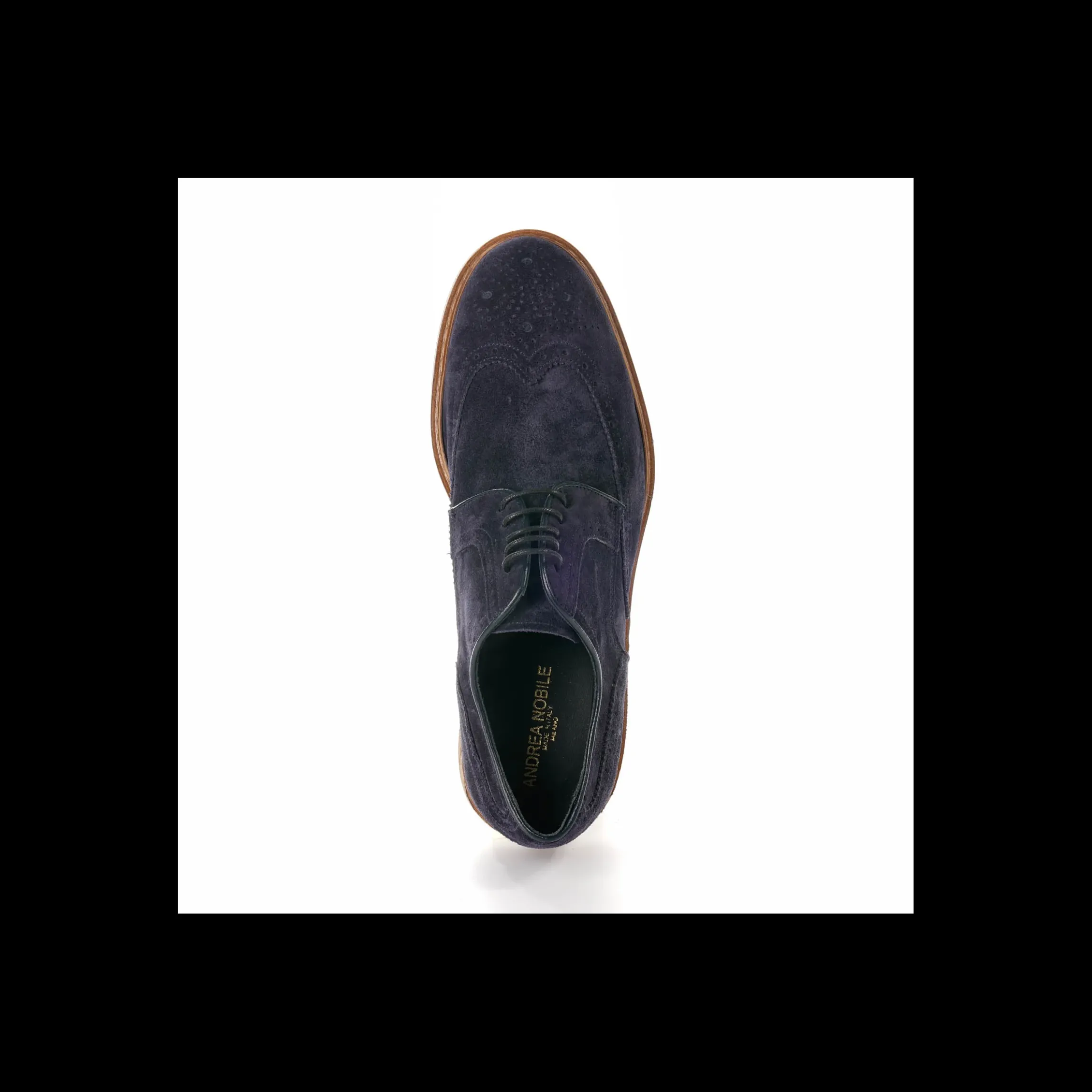 Stringata ANDREA NOBILE in camoscio colore blu scuro con dettagli colore cuoio, interno in pelle, fondo gomma colore bianco .