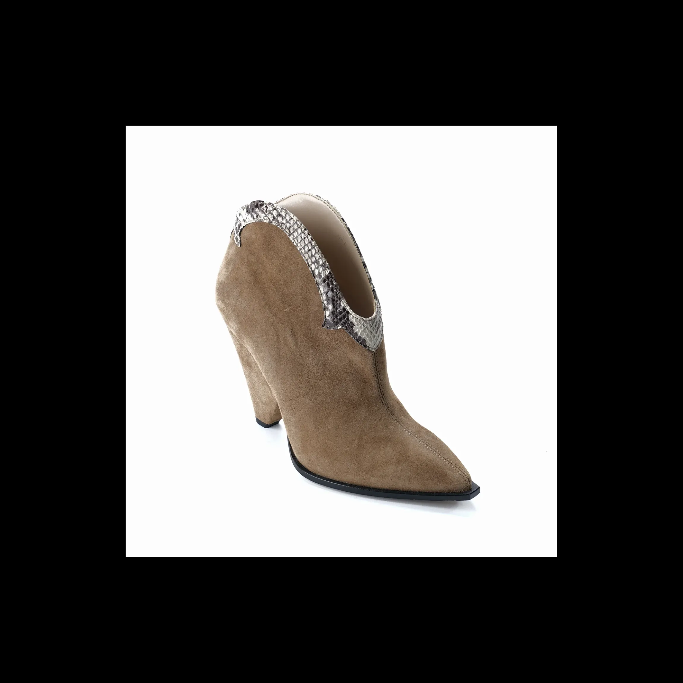 Tronchetto camperos Osvaldo Rossi Made in Italy in morbidissimo camoscio colore cammello con dettaglio di profili in pitone. Fondo cuoio e tacco a cono di 10 cm.