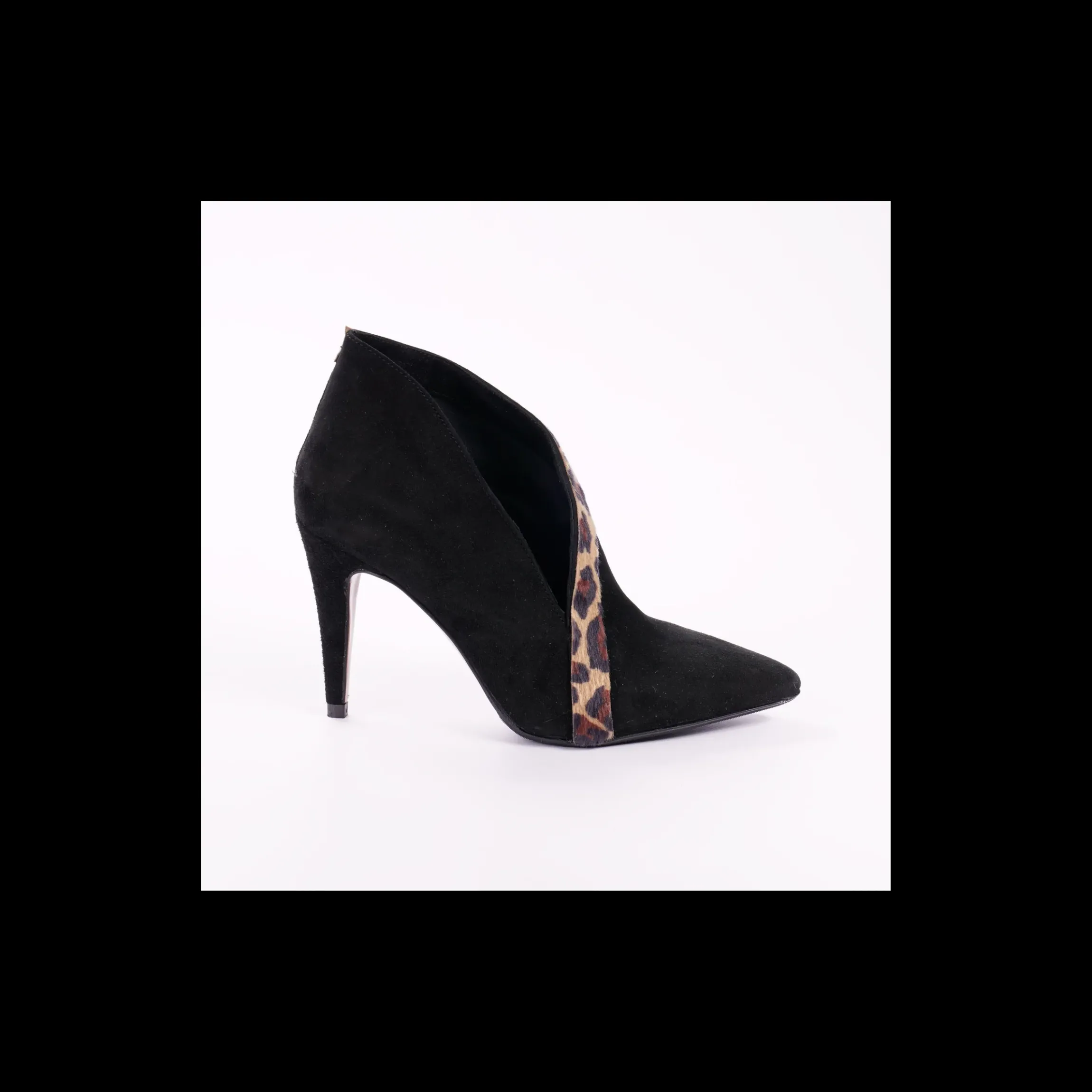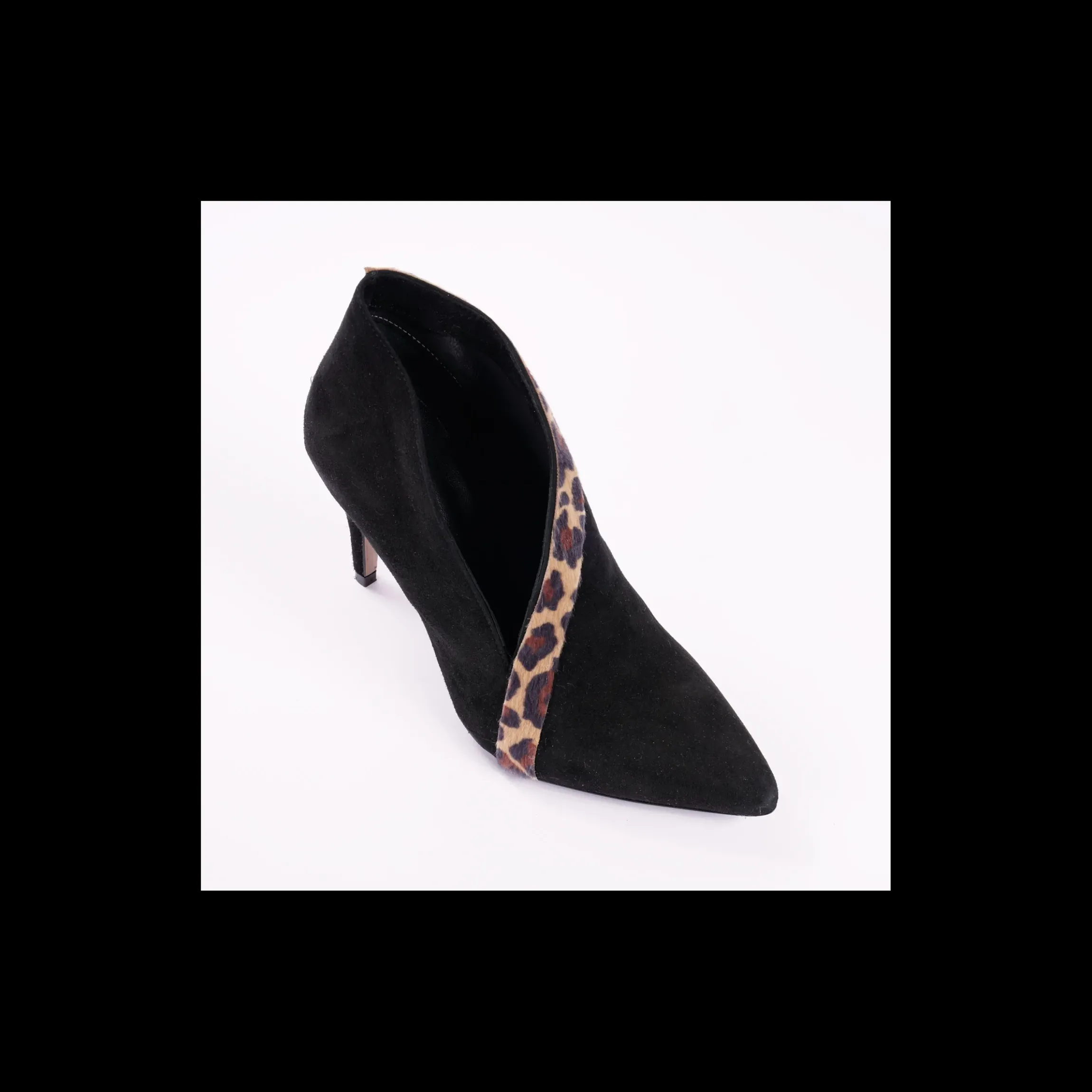 Tronchetto OSVALDO ROSSI in camoscio colore nero con inserto in cavallino stampa animalier , a punta, interno in pelle, fondo cuoio