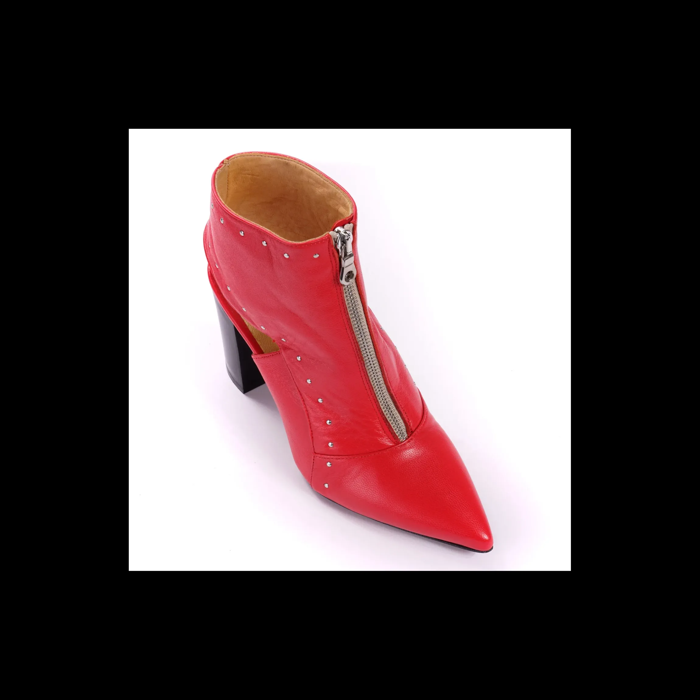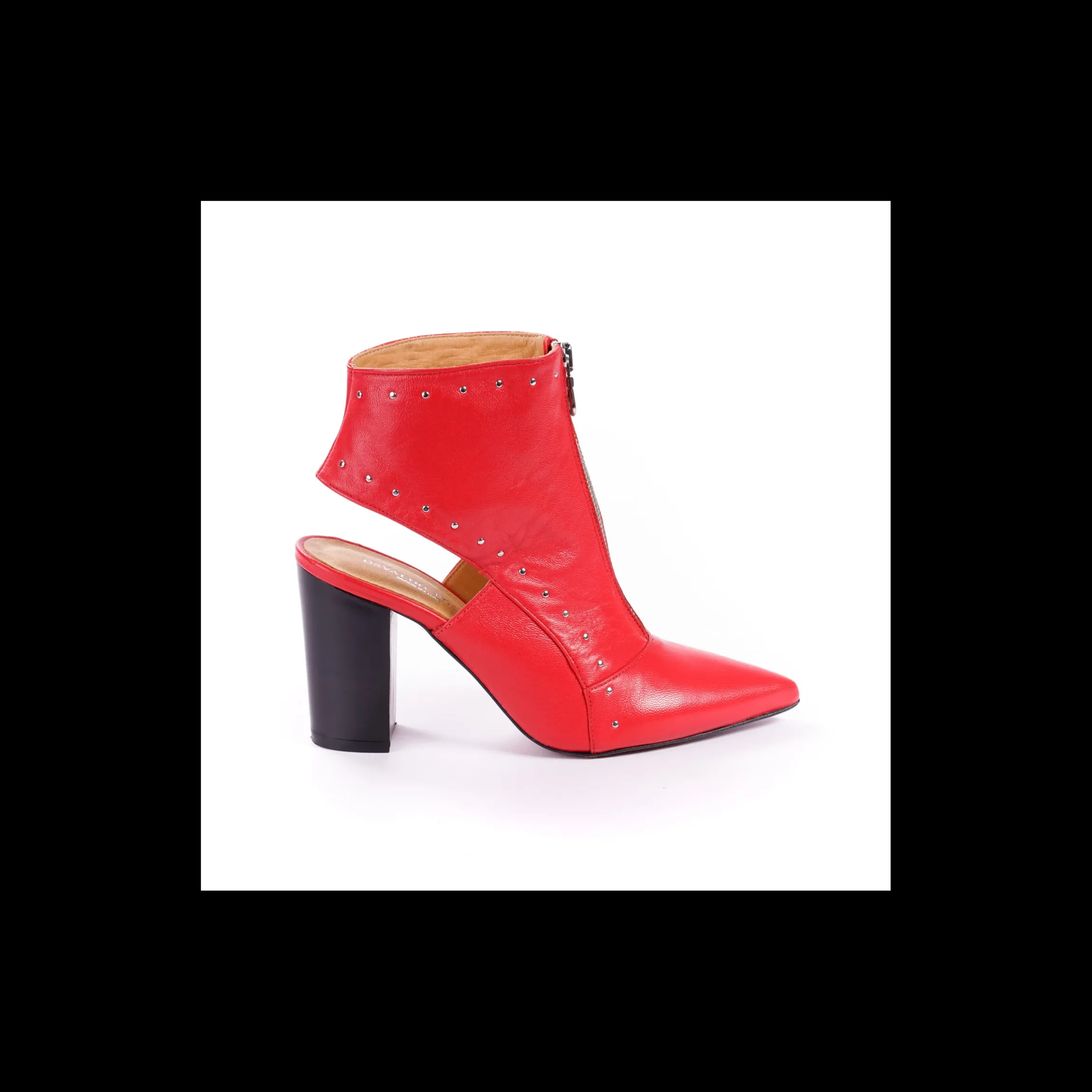 Tronchetto OSVALDO ROSSI in pelle colore rosso, applicazioni con micro borchie colore argento, a punta, interno in pelle, tallone scoperto, fondo cuoio, tacco a blocco 9 cm